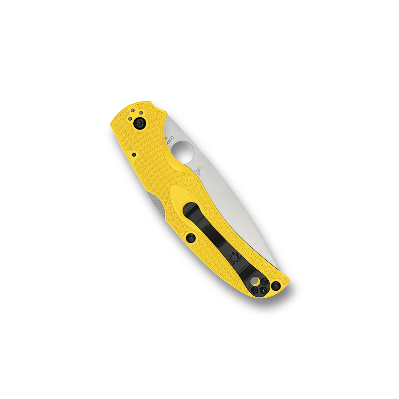Острието е с пълно плоско скосяване за оптимална геометрия на ръба и е налично в конфигурации PlainEdge™ и SpyderEdge™. То се подпира от прецизно изработен back lock механизъм и дръжка от FRN в ярко жълт цвят, видимостта на която е отлична.